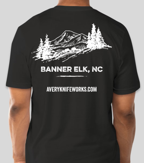 The Avery Knifeworks logo sits on the front, while the back features a custom illustrated Banner Elk mountain scene—celebrating the place and craftsmanship behind every blade we make.