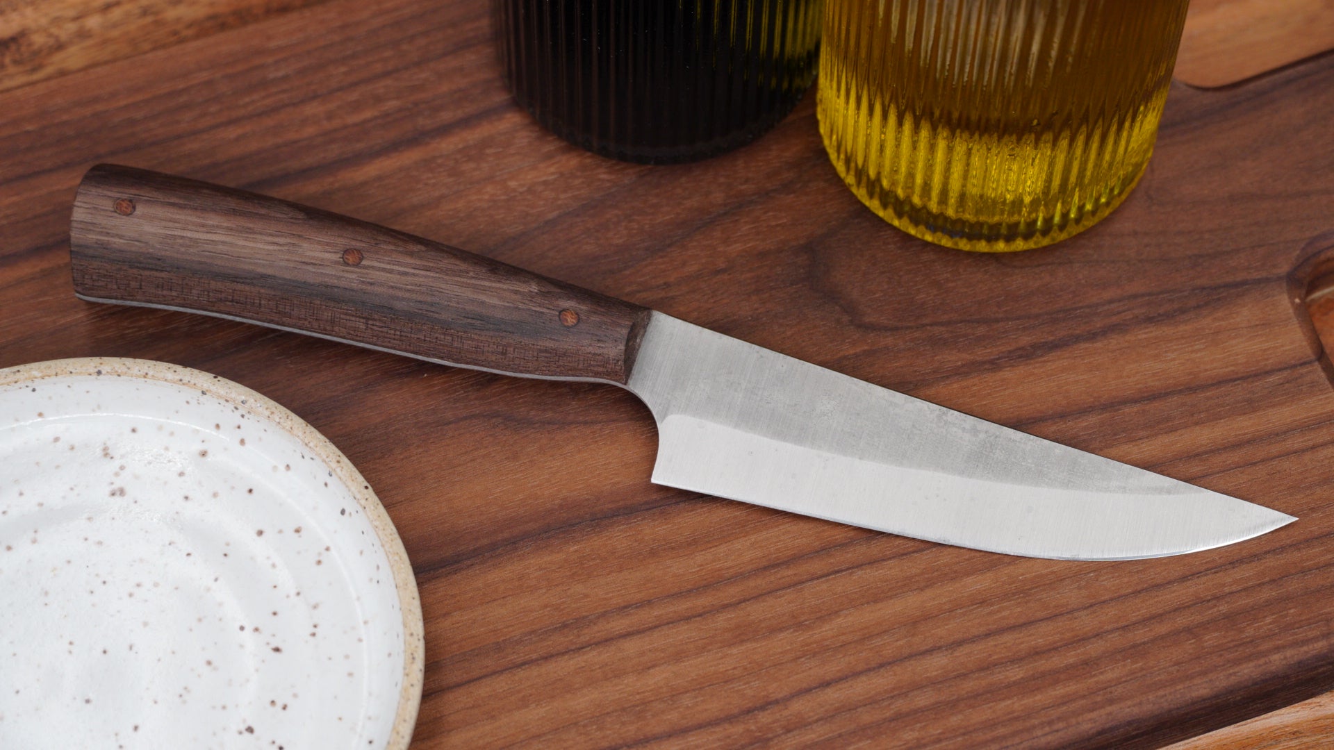 The Kitchen Utility Knife is hand-ground and hand-finished to deliver a nimble feel with impressive cutting power for its size. The blade’s profile offers enough height for board contact while remaining slim and maneuverable — allowing you to transition effortlessly between precision tasks and more demanding prep.